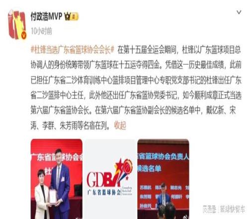 而凭借着去年全运会帮助广东队夺冠,杜锋也成为了最大的功臣。在他负责的篮球项目中,广东队四夺金牌,凭借着这一历史最佳战绩,杜锋成功当选第6届广东省篮球协会会长。至此,作为广东队历史上最成功的球员之一,杜锋又有了一个全新的身份。在杜锋当选广东省篮协会长后,不少广东球迷也开始给杜锋送祝福了。不过,也有广东球迷建议,杜锋应该尽快想办法,把深圳队的贺希宁和王浩然“忽悠”到广东队。
