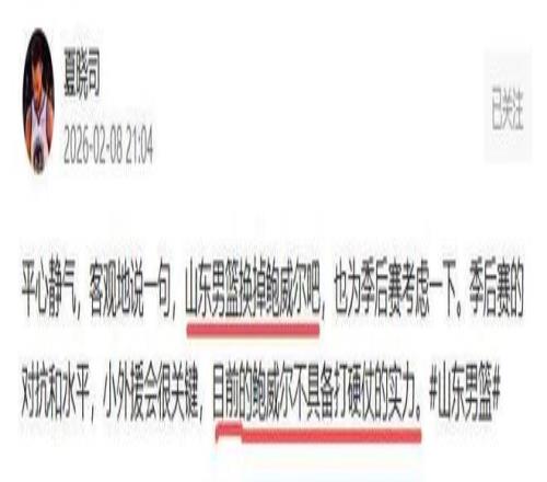 可以说鲍威尔比国内球员的表现还要差,打完半场一分不得,下半场邱彪只让他打了3分多钟,运动战一分不得,靠罚球捡到了2分。全场打了9分17秒,6投0中,运动战得0分,这样的外援相当不存在,签他也是多余的。由于个子矮,对抗差,防守端问题也大,成为对手的突破口。看到鲍威尔的表现,山东球迷和媒体人也是非常生气。山东媒体人夏晓司直接了当的表示,必须换掉鲍威尔,“平心静气,客观地说一句,山东男篮换掉鲍威尔吧,也为季后赛考虑一下。季后赛的对抗和水平,小外援会很关键,目前的鲍威尔不具备打硬仗的实力”。