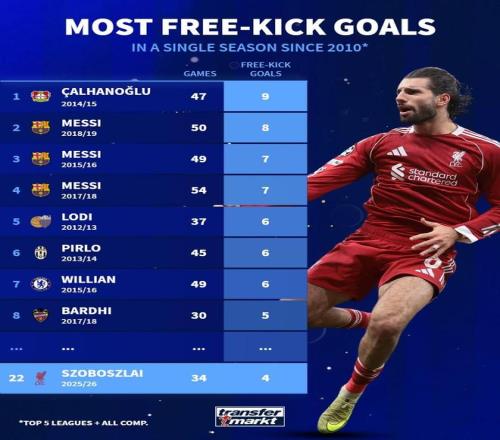 在周一凌晨进行的英超第25轮比赛中,利物浦主场1-2不敌曼城,其中索博斯洛伊打进了一记直接任意球,2月10日,德国转会市场列出了2010年以来单赛季直接任意球进球最多的球员榜。