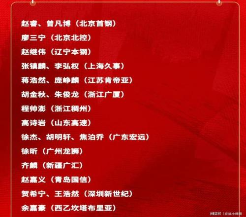 在第一阶段常规赛结束后,中国篮协就官宣了这次国家队的集训名单,分别是:赵睿,曾凡博,廖三宁,赵继伟,张镇麟,李弘权,蒋浩然,庞峥麟,胡金秋,朱俊龙,程帅澎,高诗岩,徐杰,胡明轩,焦泊乔,徐昕,齐麟,赵嘉义,贺希宁,王浩然,余嘉豪。
