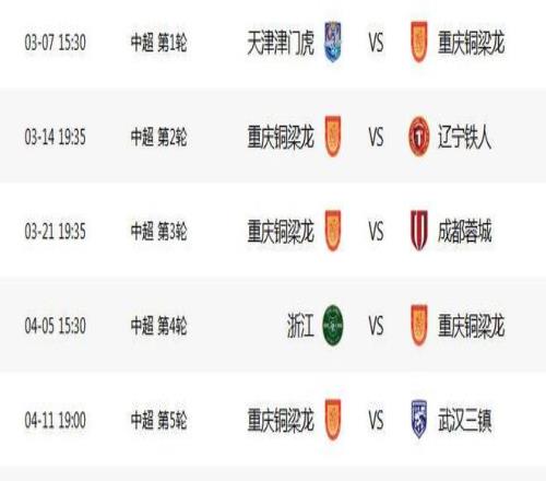 中超联赛赛程出炉,前五轮重庆铜梁龙“三主两客”,中超第1轮客战天津津门虎,争取1分;随后迎来两连主,第2轮主场迎战辽宁铁人,力争3分;第3轮主场迎战成都蓉城,拿分太难。第4轮客战浙江,争取带走1分,第5轮主场迎战武汉三镇,争取3分。当然,这只是“一厢情愿”,每场都是战术博弈,实力比拼。