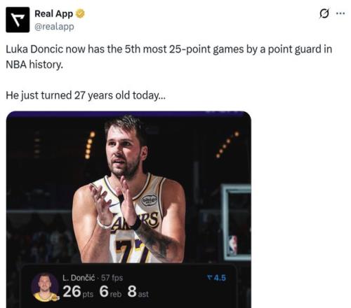 凭借这样的表现,东契奇本赛季已经34次单场交出至少25分5板5助,升至湖人队史单季第三。