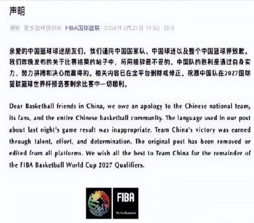 迫于汹涌舆情,国际篮联于当晚悄悄将原文中“sneaky”替换为中性词“narrow”,但未配发任何说明。这种回避式处理非但未能平息众怒,反而加剧公众对其公信力的质疑。2月27日清晨,国际篮联火速发布中英文双语致歉声明。