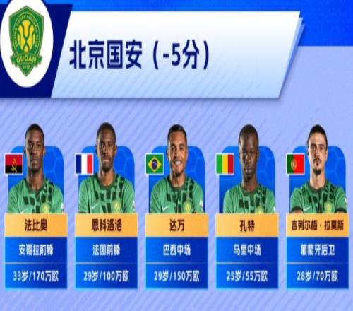 北京国安五外援:三人身价超100万欧,170万欧的法比奥、100万欧的恩科洛洛、150万欧的达万;两人身价低于100万欧,55万欧的孔特、70万欧的拉莫斯,外援总身价545万欧