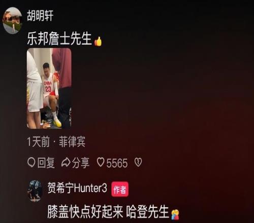 最近贺希宁在社媒与胡明轩互动中,曝光了胡明轩无缘比赛名单的原因。回国后,贺希宁发了社媒,胡明轩盛赞表现出色的贺希宁是“乐邦詹士先生”。而贺希宁则回复胡明轩:“膝盖快点好起来,哈登先生。”贺希宁虽然有些调侃的口吻,但实际是曝光了胡明轩不入比赛名单的原因。