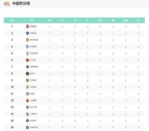 2026中超第1轮战况+积分榜:蓉城领跑海港爆冷