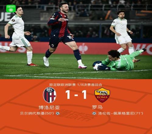 北京时间3月13日欧足联欧洲联赛 1/8决赛首回合,博洛尼亚对阵罗马。下半场贝尔纳代斯基进球打破僵局,洛伦佐-佩莱格里尼破门将比分扳平。最终比分博洛尼亚 1-1 罗马。