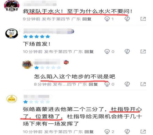 在广东以4分优势险胜深圳的比赛中,张皓嘉在前三节得分吞蛋的情况下,末节仍被杜锋重用,虽然命中两个关键三分球,拯救球队于水火之中,但球迷对于张皓嘉仍不买账:“球队为什么陷入水火之中,你得问他”、“蒙进去第二个三分,杜指导开心了,位置稳了,给了无限机会,几十场下来终于有一场发挥了。”