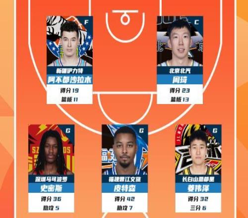 数据领先者方面:福建晋江文旅球员皮特森以单场42分的数据领衔得分榜;
