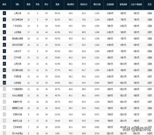 数据方面,上海男篮场均得到96.3分联盟第一,场均失分80.6分联盟第一,场均44.5篮板联盟第一,场均22.8个助攻联盟第一。