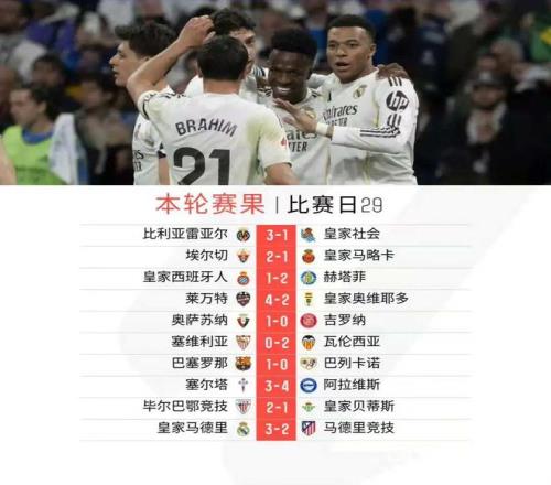 北京时间3月23日凌晨,西甲第29轮10场结束全部较量。本轮焦点对话自然是“马德里德比”,皇家马德里最终3比2力克马德里竞技报第一回合一箭之仇,继续排名第二的同时,与马竞的分差也来到了11分;巴塞罗那凭借阿劳霍的进球,1球小胜巴列卡诺继续领跑西甲;比利亚雷亚尔3比1击败皇家社会,实现了对马竞的反超;而皇家贝蒂斯本轮1比2负于毕尔巴鄂竞技,已经落后欧冠区达13分,机会愈发渺茫。