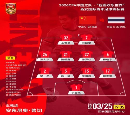 3月25日晚,2026西安国际青年足球锦标赛首个比赛日,中国U23队坐镇西安国际足球中心,迎战泰国U23队。赛前,双方首发名单出炉。